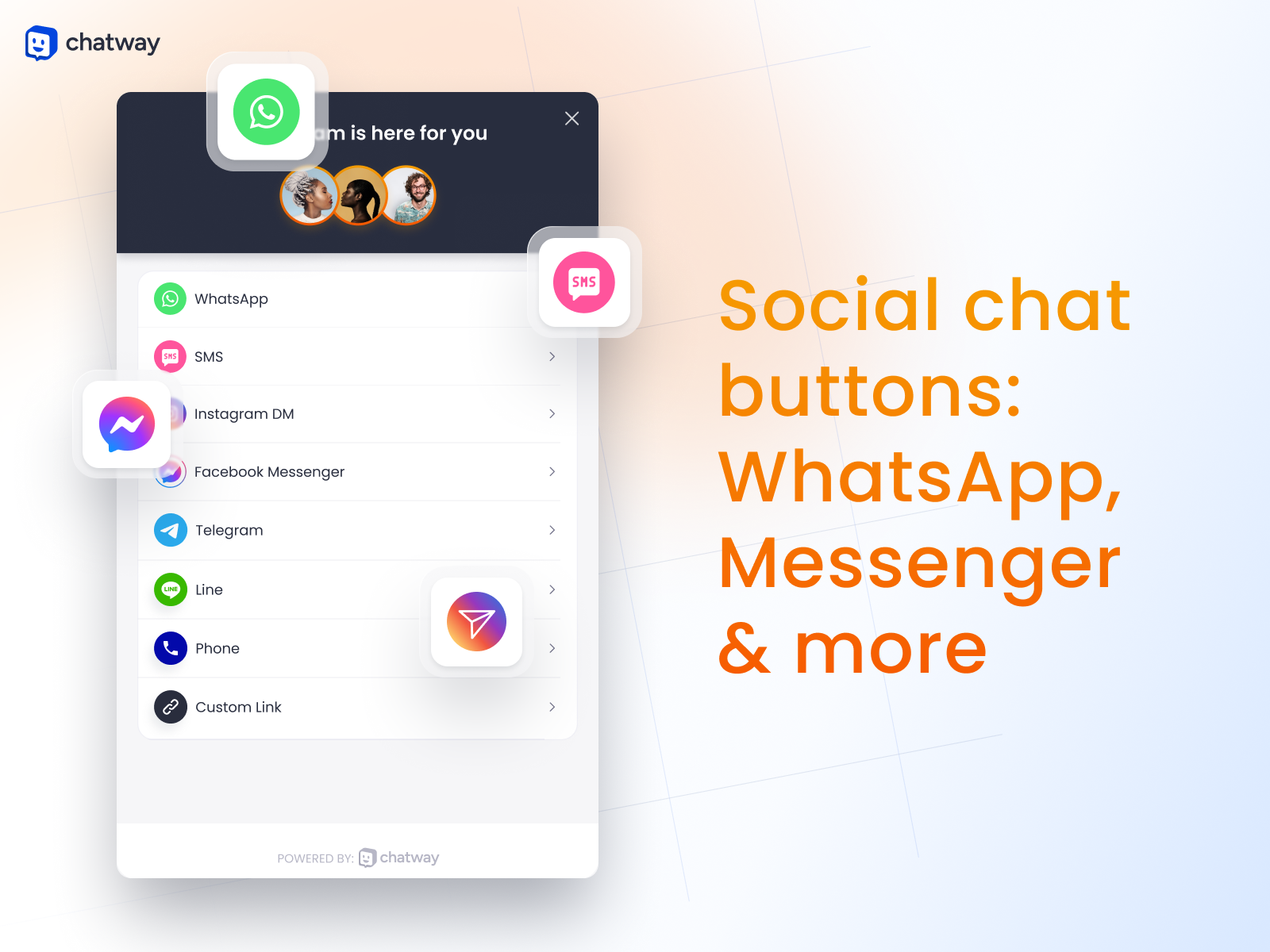 Add chat buttons like WhatsApp, Facebook Messenger, Instagram DM, SMS, phone, Telegram, Line, or custom chat buttons.