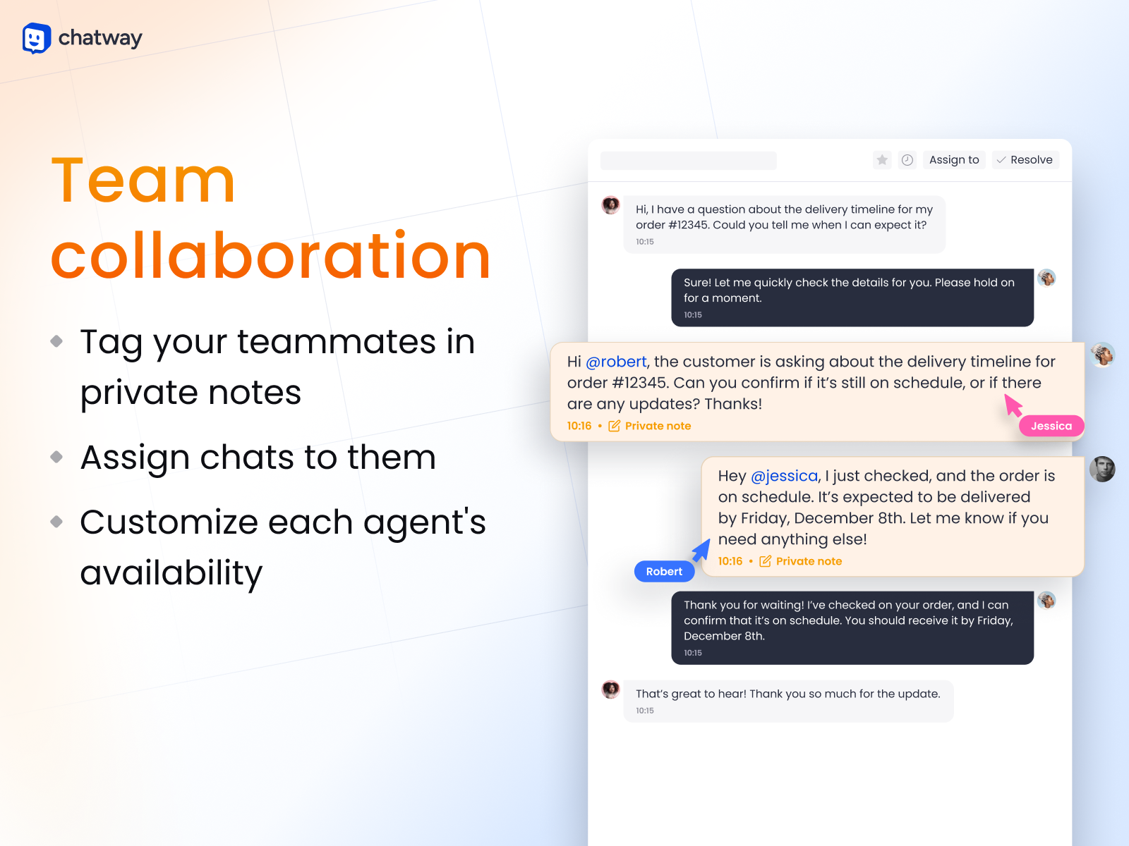 Live chat conversations can be assigned to support agents, while the AI chatbot can handle common questions automatically and provide 24/7 support. Escalate to more experienced helpdesk reps when necessary through live chat