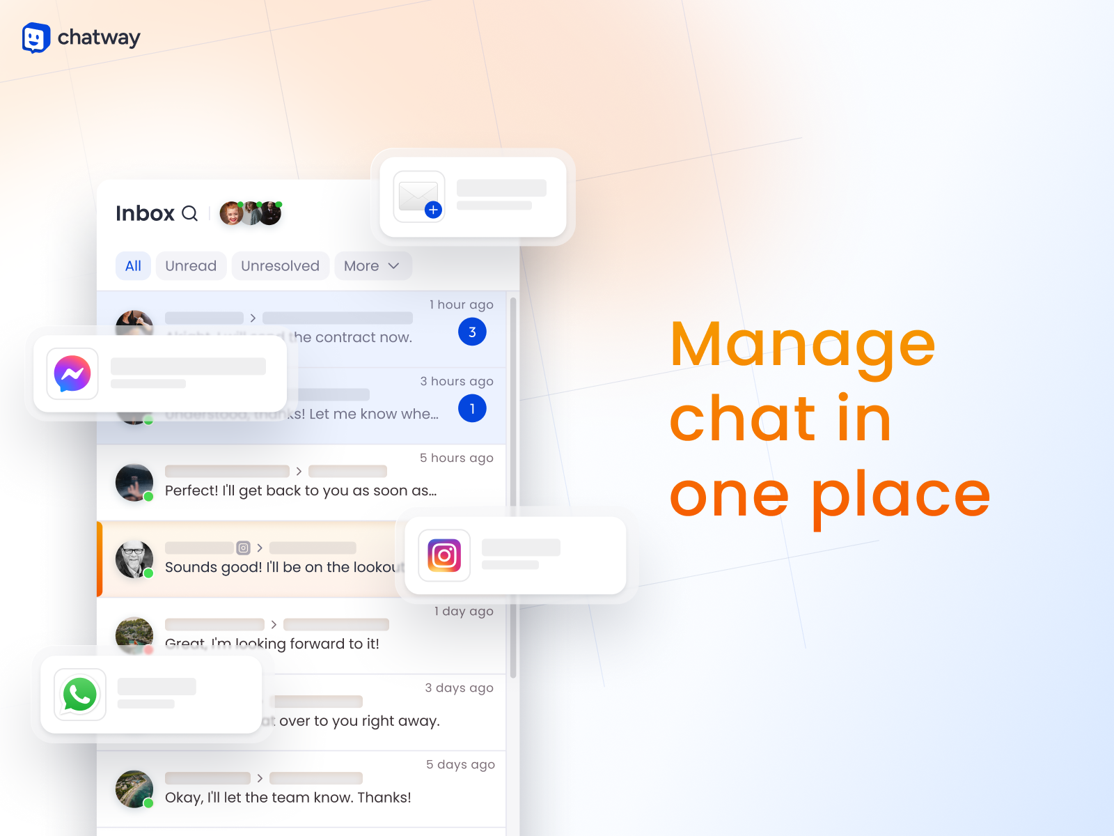 Integrate your WhatsApp Business, Facebook Messenger, email & Instagram DMs to your live chat messages.
