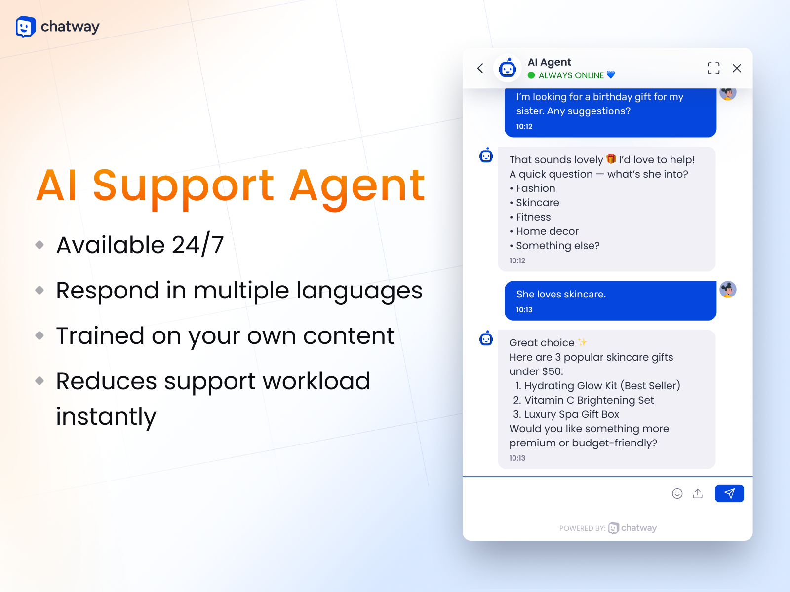 Fantastic addition to my site!I recently added the Chatway AI Live Chat app to my site, and it resulted in a sale just two days later! I tested it out to make sure it could answer a...