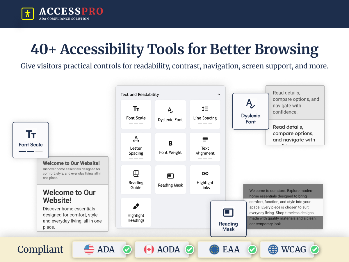 AccessPro provides a powerful and growing set of accessibility tools to help make your website more inclusive and user-friendly: