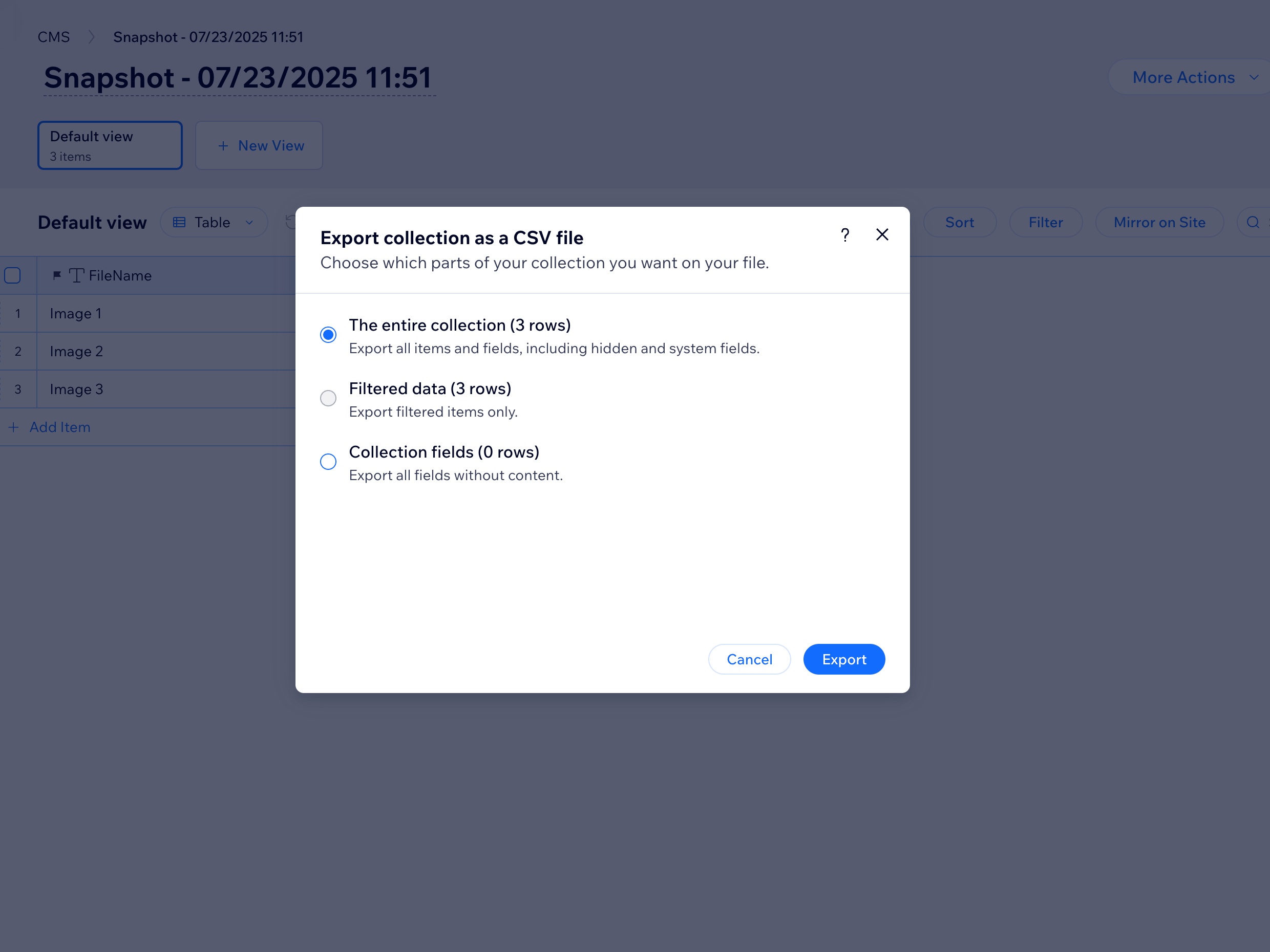 Easily export your site's image library into a dynamic CMS collection — in just one click. The Media Manager Snapshot to CMS app takes a real-time snapshot of all your public image files stored in the Media Manager and generates a structured CMS collection with each file’s name and URL. This is perfect for developers, content teams, or automations that need to reference image data dynamically in repeaters, galleries, or external APIs.