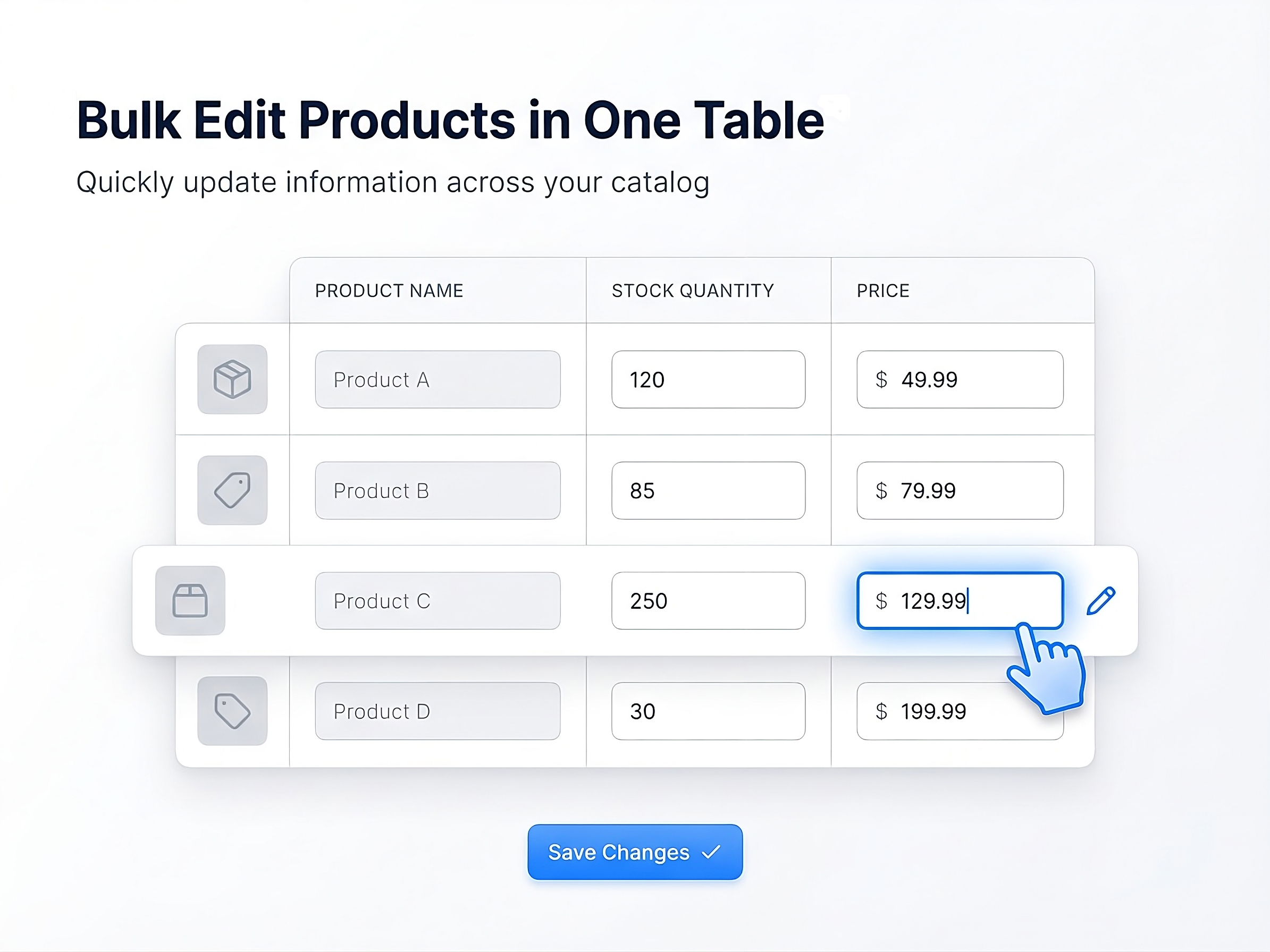 Managing an online store often requires tedious data entry that takes time away from growing your business. This tool solves that problem by transforming your catalog management into a streamlined, single-page experience. You no longer need to open individual product pages to make simple changes. Instead, you can view your entire inventory in a dynamic table that allows for instant, inline editing of critical fields.