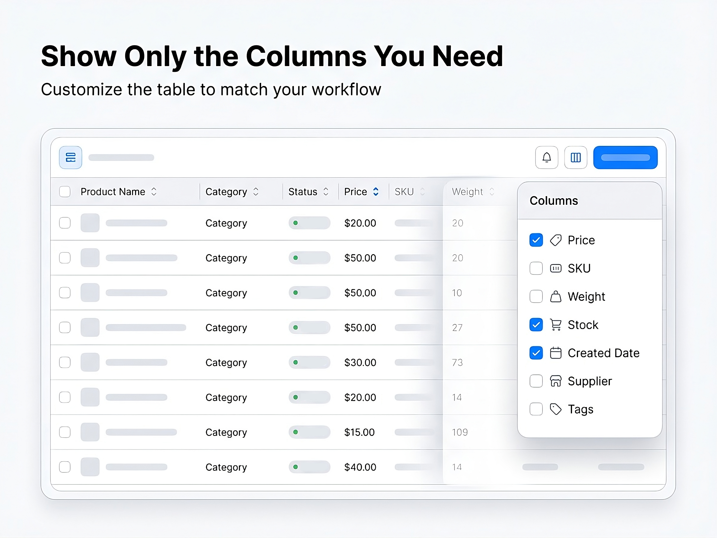 The interface gives you complete control over your workflow by letting you select which columns are visible. You can quickly adjust prices, update SKU codes, modify weights, and toggle inventory tracking settings for multiple items at once. If you need to focus on specific types of products, the advanced filtering options allow you to narrow down your list by variants so you only see what needs your attention.