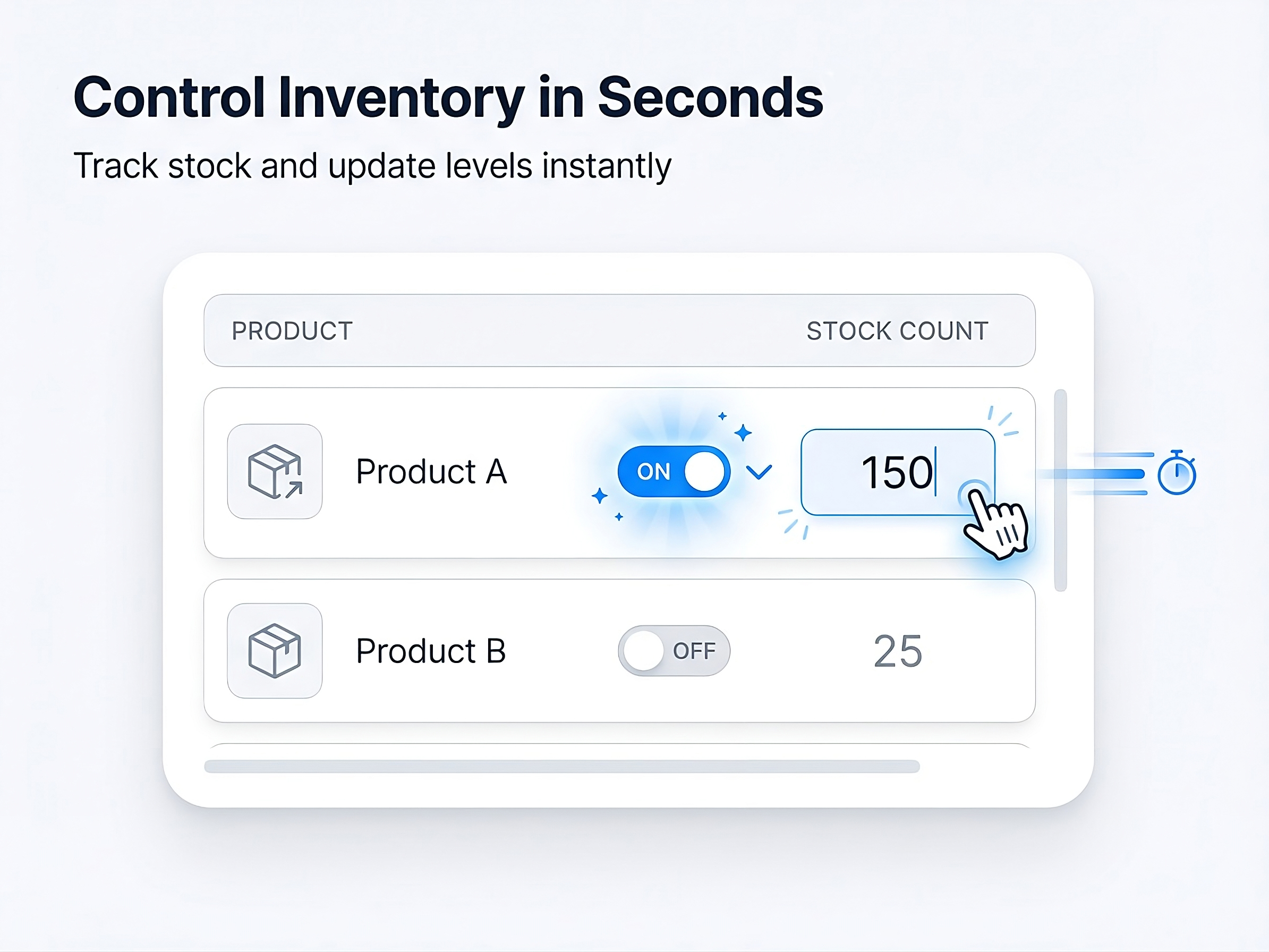 Toggle inventory tracking and update stock levels directly from the dashboard
