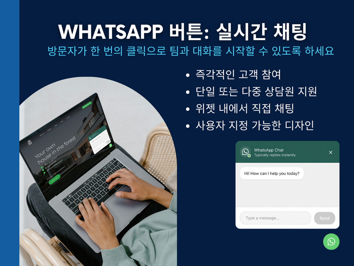 WhatsApp 채팅을 사용하면 웹사이트 방문자가 WhatsApp을 통해 즉시 연락할 수 있습니다. 몇 분 만에 웹사이트에 WhatsApp 채팅 버튼을 추가하세요 — 코딩이 필요 없습니다.